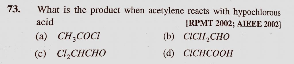 What is the product when acetylene reacts with hypochlorous acid (a) CH3COCl (b) ClCH2CHO (c) Cl2CHCHO (d) ClCHCOOH What is the product when acetylene reacts with hypochlorous acid (a) CH3COCl (b) ClCH2CHO (c) Cl2CHCHO (d) ClCHCOOH December 14, 2020 Category: Uncategorised (JEE Advanced Physics by BM Sharma + GMP Solutions) , Facebook Messenger WhatsApp Share this:TwitterFacebook Related