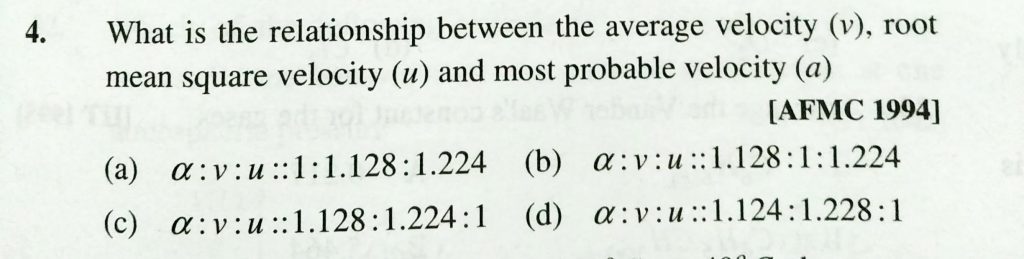 What is the relationship between the average velocity (v) , root mean square velocity (u) and most probable velocity (a) root mean square velocity (u) and most probable velocity (a) What is the relationship between the average velocity (v) February 12, 2021 Category: Uncategorised (JEE Advanced Physics by BM Sharma + GMP Solutions) , Facebook Messenger WhatsApp Share this:TwitterFacebook Related