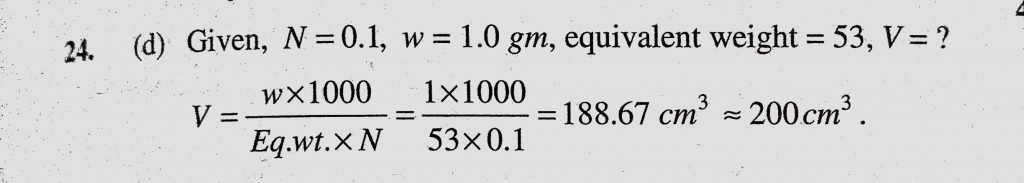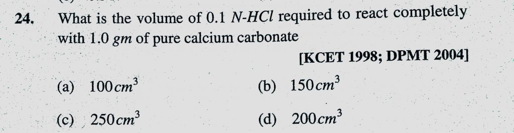 What is the volume of 0.1 N-HCl required to react completely with 1.0 gm of pure calcium carbonate What is the volume of 0.1 N-HCl required to react completely with 1.0 gm of pure calcium carbonate December 7, 2020 Category: Uncategorised (JEE Advanced Physics by BM Sharma + GMP Solutions) , Facebook Messenger WhatsApp Share this:TwitterFacebook Related
