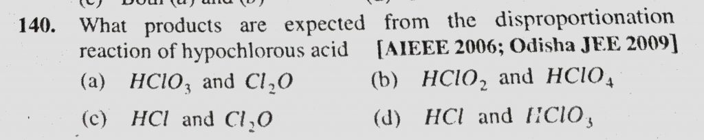 What products are expected from the disproportionation reaction of hypochlorous acid (a) HClO3 and Cl2O (b) HClO2 and HClO4 What products are expected from the disproportionation reaction of hypochlorous acid (a) HClO3 and Cl2O (b) HClO2 and HClO4 November 25, 2020 Category: Uncategorised (JEE Advanced Physics by BM Sharma + GMP Solutions) , Facebook Messenger WhatsApp Share this:TwitterFacebook Related