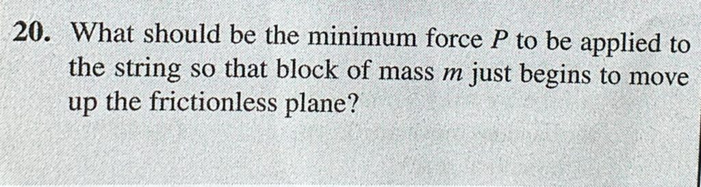 What should be the minimum force P to be applied to the string so that block of mass m just begins to move up the frictionless plane? What should be the minimum force P to be applied to the string so that block of mass m just begins to move up the frictionless plane? September 25, 2020 Category: Uncategorised (JEE Advanced Physics by BM Sharma + GMP Solutions) , Facebook Messenger WhatsApp Share this:TwitterFacebook Related