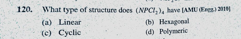 What type of structure does (NPCl2)4 have (a) Linear (b) Hexagonal (c) Cyclic (d) Polymeric What type of structure does (NPCl2)4 have (a) Linear (b) Hexagonal (c) Cyclic (d) Polymeric November 22, 2020 Category: Uncategorised (JEE Advanced Physics by BM Sharma + GMP Solutions) , Facebook Messenger WhatsApp Share this:TwitterFacebook Related