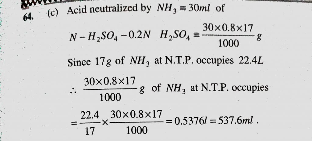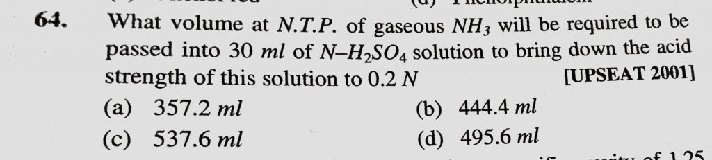 What volume at N.T.P. of gaseous NH3 will be required to be passed into 30 ml of N-H2SO4 to bring down the acid strength of this solution to 0.2 N What volume at N.T.P. of gaseous NH3 will be required to be passed into 30 ml of N-H2SO4 to bring down the acid strength of this solution to 0.2 N December 7, 2020 Category: Uncategorised (JEE Advanced Physics by BM Sharma + GMP Solutions) , Facebook Messenger WhatsApp Share this:TwitterFacebook Related