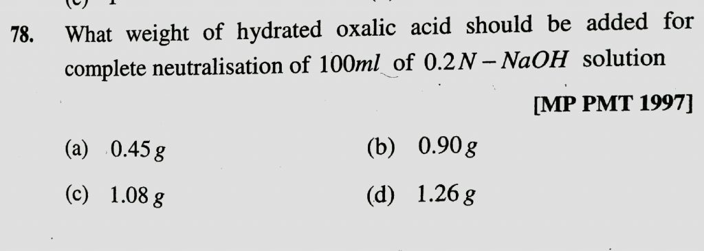 What weight of hydrated oxalic acid should be addeed for complete neutralisation of 100 ml of 0.2 N – NaOH solution What weight of hydrated oxalic acid should be addeed for complete neutralisation of 100 ml of 0.2 N - NaOH solution December 11, 2020 Category: Uncategorised (JEE Advanced Physics by BM Sharma + GMP Solutions) , Facebook Messenger WhatsApp Share this:TwitterFacebook Related