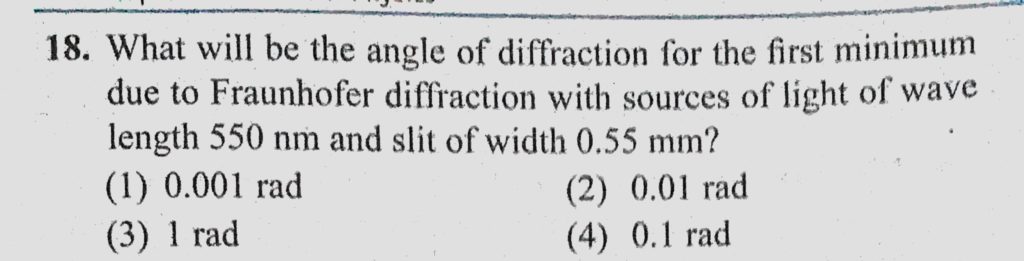 What will be the angle of diffraction for the first minimum due to Fraunhofer diffraction with sources of light of wave length 550 nm and slit of width 0.55 mm ? What will be the angle of diffraction for the first minimum due to Fraunhofer diffraction with sources of light of wave length 550 nm and slit of width 0.55 mm ? October 12, 2020 Category: Uncategorised (JEE Advanced Physics by BM Sharma + GMP Solutions) , Facebook Messenger WhatsApp Share this:TwitterFacebook Related