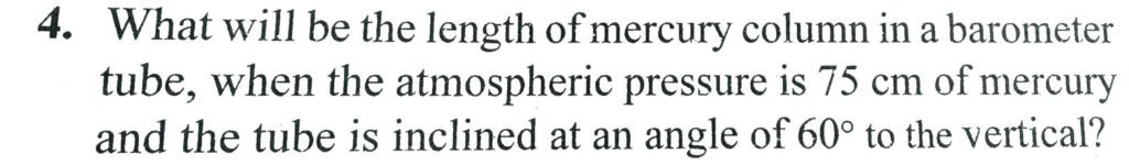 What will be the length of mercury column in a barometer tube, when the atmospheric pressure is 75 cm of mercurey and the tube is inclined at an angle of 60 degree to the verticle? What will be the length of mercury column in a barometer tube when the atmospheric pressure is 75 cm of mercurey and the tube is inclined at an angle of 60 degree to the verticle? October 6, 2020 Category: Uncategorised (JEE Advanced Physics by BM Sharma + GMP Solutions) , Facebook Messenger WhatsApp Share this:TwitterFacebook Related