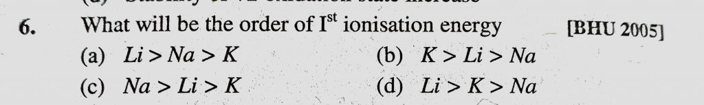 What will be the order of 1st ionisation energy (a) Li > Na > K (b) K > Li > Na (c) Na > Li > K (d) Li > K > Na What will be the order of 1st ionisation energy (a) Li > Na > K (b) K > Li > Na (c) Na > Li > K (d) Li > K > Na November 10, 2020 Category: Uncategorised (JEE Advanced Physics by BM Sharma + GMP Solutions) , Facebook Messenger WhatsApp Share this:TwitterFacebook Related