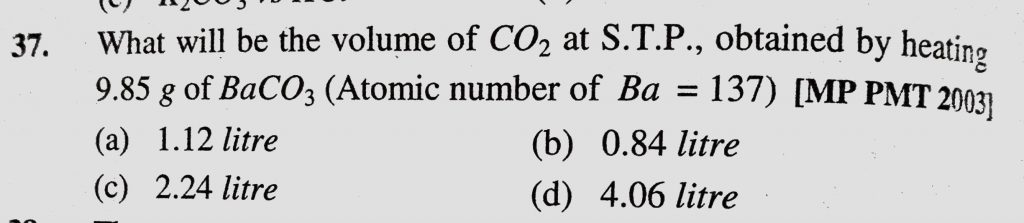 What will be the volume of CO2 at S.T.P., obtained by heating 9.85 g of BaCO3 (Atomic number of Ba = 137) obtained by heating 9.85 g of BaCO3 (Atomic number of Ba = 137) What will be the volume of CO2 at S.T.P. December 7, 2020 Category: Uncategorised (JEE Advanced Physics by BM Sharma + GMP Solutions) , Facebook Messenger WhatsApp Share this:TwitterFacebook Related
