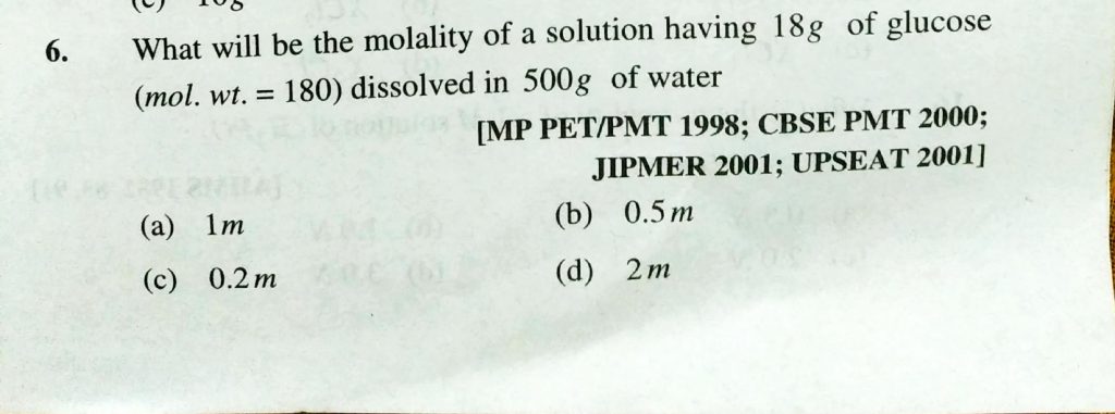 What will be themolality of a solution having 18g of glucose (mol. wt. = 180 ) dissolved in 500g of water What will be themolality of a solution having 18g of glucose (mol. wt. = 180 ) dissolved in 500g of water December 10, 2020 Category: Uncategorised (JEE Advanced Physics by BM Sharma + GMP Solutions) , Facebook Messenger WhatsApp Share this:TwitterFacebook Related