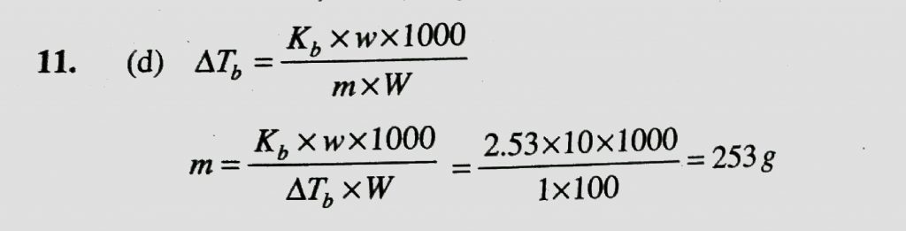 When 10 g of a non-volatile solute is dissolved in 100 g of benzene, it raises boiling point by 1∘C then molecular mass of the solute is (Kb for benzene =2.53 k/m) it raises boiling point by 1∘C then molecular mass of the solute is (Kb for benzene =2.53 k/m) When 10 g of a non-volatile solute is dissolved in 100 g of benzene December 13, 2020 Category: Uncategorised (JEE Advanced Physics by BM Sharma + GMP Solutions) , Facebook Messenger WhatsApp Share this:TwitterFacebook Related