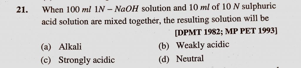 When 100 ml 1N-NaOH solution and 10 ml of 10 N sulphuric acid solution are mixed together, the resulting solution will be the resulting solution will be When 100 ml 1N-NaOH solution and 10 ml of 10 N sulphuric acid solution are mixed together December 7, 2020 Category: Uncategorised (JEE Advanced Physics by BM Sharma + GMP Solutions) , Facebook Messenger WhatsApp Share this:TwitterFacebook Related
