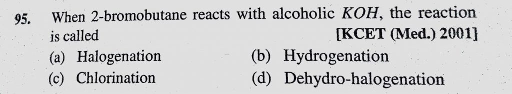 When 2-bromobutane reacts with alcoholic KOH, the reaction is called (a) Halogenation (b) Hydrogenation (c) Chlorination (d) Dehydro-halogenation the reaction is called (a) Halogenation (b) Hydrogenation (c) Chlorination (d) Dehydro-halogenation When 2-bromobutane reacts with alcoholic KOH December 13, 2020 Category: Uncategorised (JEE Advanced Physics by BM Sharma + GMP Solutions) , Facebook Messenger WhatsApp Share this:TwitterFacebook Related
