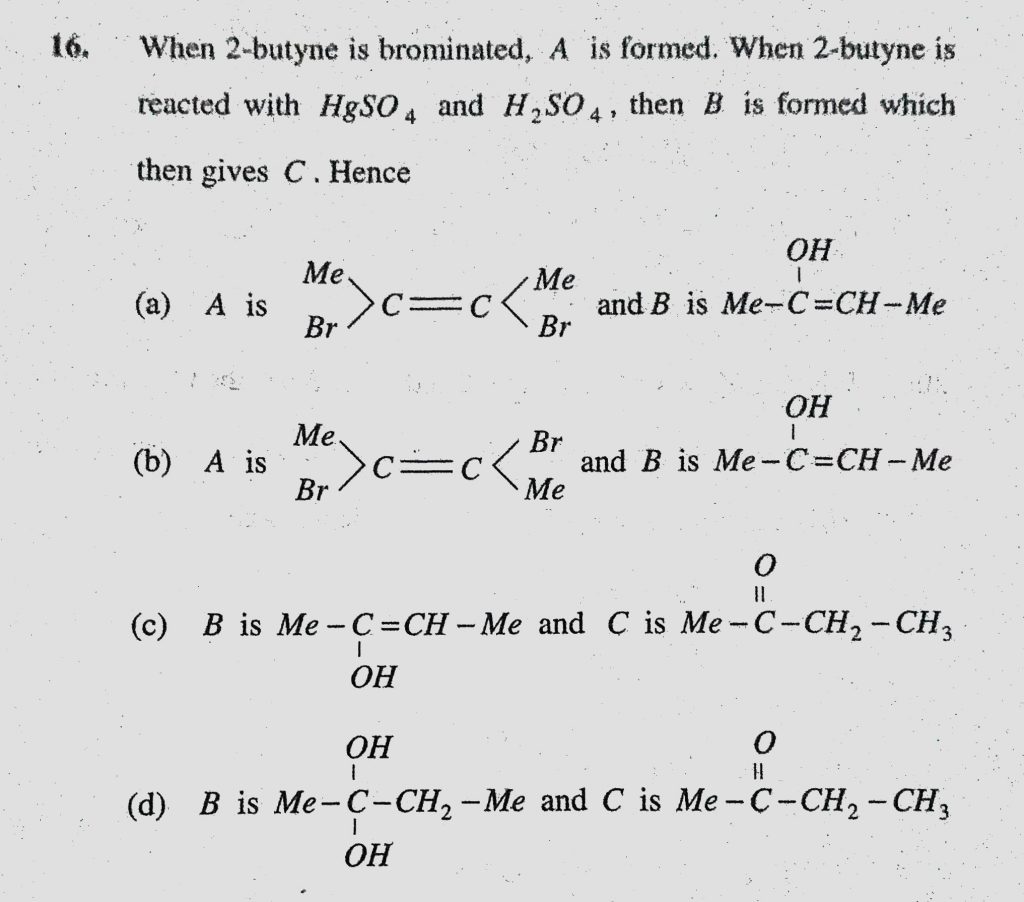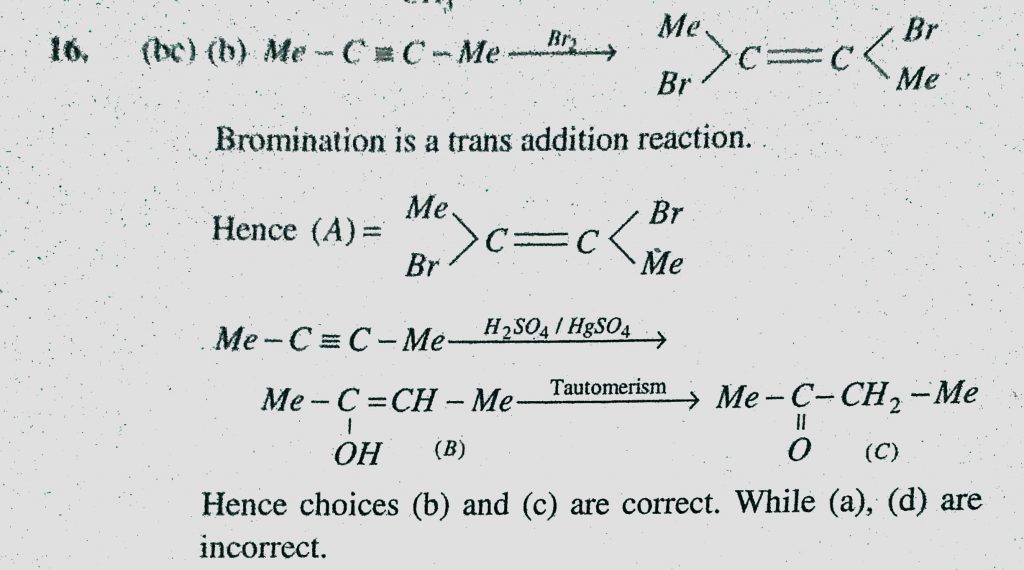 When 2-butyne is brominated, A is formed. When 2-butyne is reacted with HgSO4 and H2SO4, then B is formed which then gives C. Hence A is formed. When 2-butyne is reacted with HgSO4 and H2SO4 then B is formed which then gives C. Hence When 2-butyne is brominated December 16, 2020 Category: Uncategorised (JEE Advanced Physics by BM Sharma + GMP Solutions) , Facebook Messenger WhatsApp Share this:TwitterFacebook Related