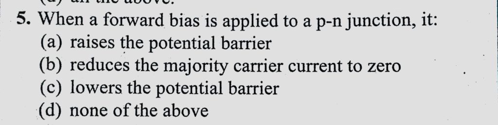 When a forward bias is applied to a p-n junction, it : (a) raises the potential barrier (b) reduces the majority carrier current to zero. it : (a) raises the potential barrier (b) reduces the majority carrier current to zero. When a forward bias is applied to a p-n junction October 20, 2020 Category: Uncategorised (JEE Advanced Physics by BM Sharma + GMP Solutions) , Facebook Messenger WhatsApp Share this:TwitterFacebook Related
