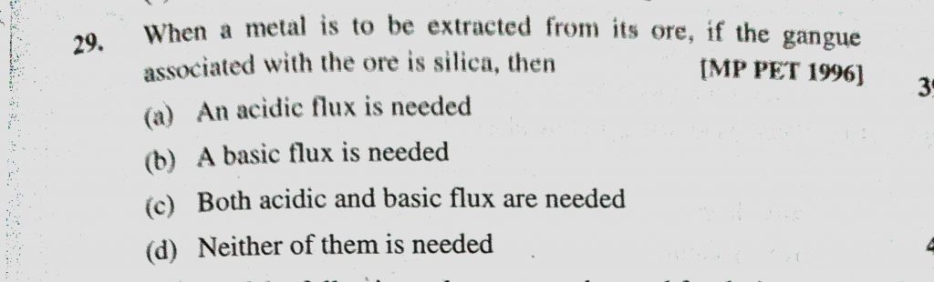 When a metal is to be extracted from its ore, if the gangue associated with the ore is silica, then (a) An acidic flux is needed (b) A basic flux is needed (c) Both acidic and basic if the gangue associated with the ore is silica then (a) An acidic flux is needed (b) A basic flux is needed (c) Both acidic and basic When a metal is to be extracted from its ore November 12, 2020 Category: Uncategorised (JEE Advanced Physics by BM Sharma + GMP Solutions) , Facebook Messenger WhatsApp Share this:TwitterFacebook Related