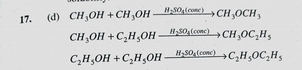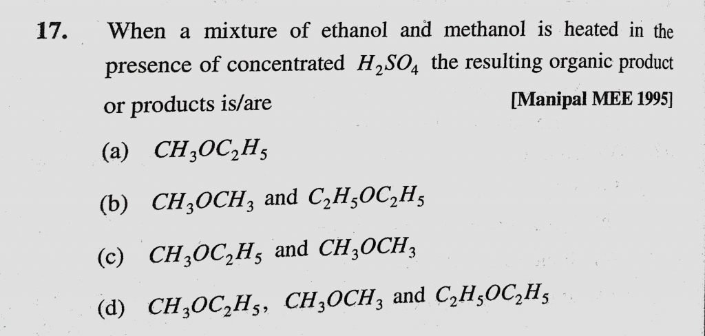 When a mixture of ethanol and methanol is heated in the presence of concentrated H2SO4 the resulting organic product or products is/are (a) CH3OC2H5 (b) CH3OCH3 and C2H5OC2H5 When a mixture of ethanol and methanol is heated in the presence of concentrated H2SO4 the resulting organic product or products is/are (a) CH3OC2H5 (b) CH3OCH3 and C2H5OC2H5 February 11, 2021 Category: Uncategorised (JEE Advanced Physics by BM Sharma + GMP Solutions) , Facebook Messenger WhatsApp Share this:TwitterFacebook Related