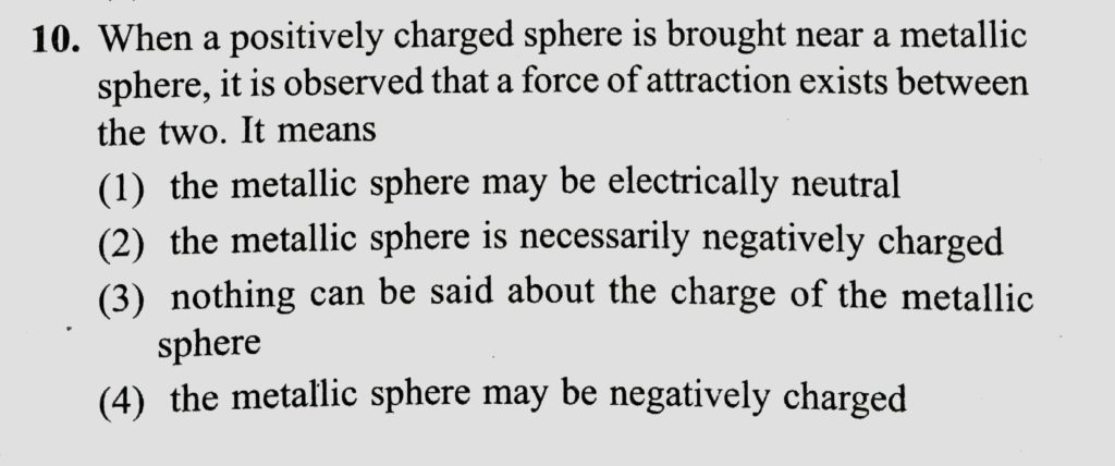 When a positively charged sphere is brought near a metallic sphere , it is observed that a force of attraction exists between the two. It means it is observed that a force of attraction exists between the two. It means : When a positively charged sphere is brought near a metallic sphere October 30, 2020 Category: Uncategorised (JEE Advanced Physics by BM Sharma + GMP Solutions) , Facebook Messenger WhatsApp Share this:TwitterFacebook Related