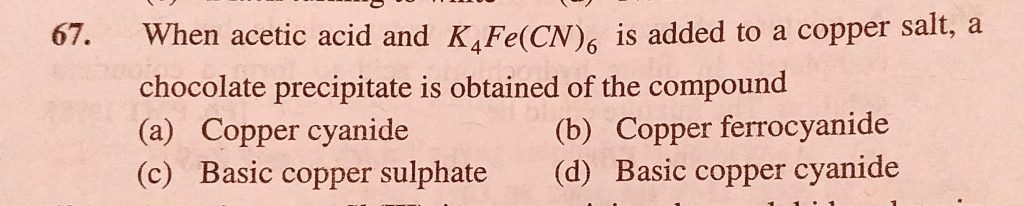 When acetic acid and K4Fe(CN)6 is added to a copper salt, a chocolate precipitate is obtained of the compound a chocolate precipitate is obtained of the compound When acetic acid and K4Fe(CN)6 is added to a copper salt December 7, 2020 Category: Uncategorised (JEE Advanced Physics by BM Sharma + GMP Solutions) , Facebook Messenger WhatsApp Share this:TwitterFacebook Related