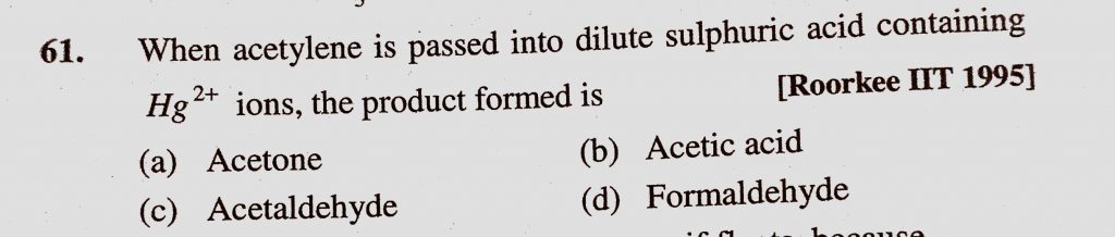 When acetylene is passed into dilute sulphuric acid containing Hg2+ ions , the product formed is (a) Acetone (b) Acetic acid (c) Acetaldehyde the product formed is (a) Acetone (b) Acetic acid (c) Acetaldehyde When acetylene is passed into dilute sulphuric acid containing Hg2+ ions December 16, 2020 Category: Uncategorised (JEE Advanced Physics by BM Sharma + GMP Solutions) , Facebook Messenger WhatsApp Share this:TwitterFacebook Related
