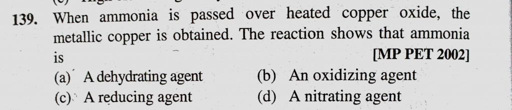 When ammonia is passed over heated copper oxide, the metallic copper is obtained. The reaction shows that ammonia is (a) A dehydrating agent (b) An oxidizing agent the metallic copper is obtained. The reaction shows that ammonia is (a) A dehydrating agent (b) An oxidizing agent When ammonia is passed over heated copper oxide November 23, 2020 Category: Uncategorised (JEE Advanced Physics by BM Sharma + GMP Solutions) , Facebook Messenger WhatsApp Share this:TwitterFacebook Related