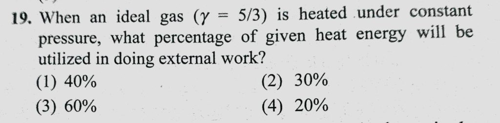 When an ideal gas (gama = 5/3) is heated under constant pressure, what percentage of given heat energy will be utilized in doing external work? what percentage of given heat energy will be utilized in doing external work? When an ideal gas (gama = 5/3) is heated under constant pressure October 28, 2020 Category: Uncategorised (JEE Advanced Physics by BM Sharma + GMP Solutions) , Facebook Messenger WhatsApp Share this:TwitterFacebook Related