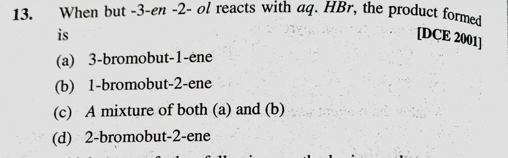 When but-3-en-2-ol reacts with aq. HBr, the product formed is (a) 3-bromobut-1-ene (b) 1-bromobut-2-ene (c) A mixture of both (a) and (b) (d) 2-bromobut-2-ene the product formed is (a) 3-bromobut-1-ene (b) 1-bromobut-2-ene (c) A mixture of both (a) and (b) (d) 2-bromobut-2-ene When but-3-en-2-ol reacts with aq. HBr February 9, 2021 Category: Uncategorised (JEE Advanced Physics by BM Sharma + GMP Solutions) , Facebook Messenger WhatsApp Share this:TwitterFacebook Related