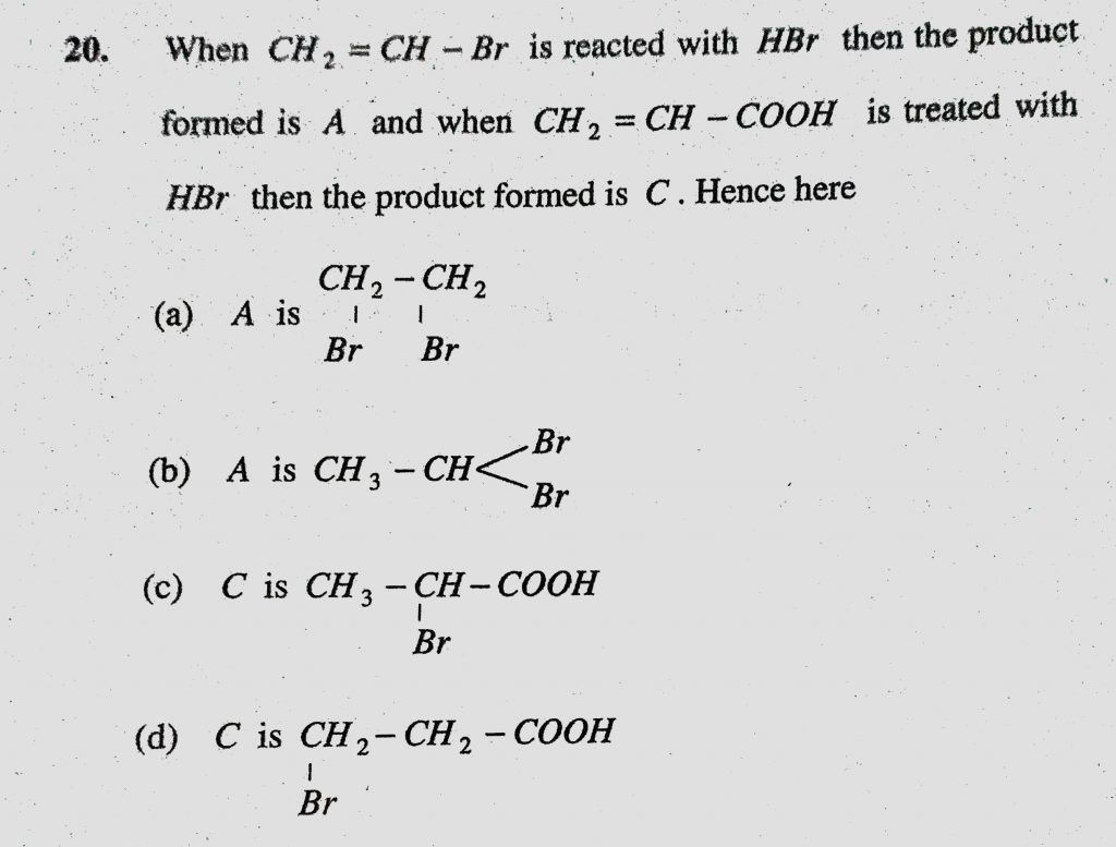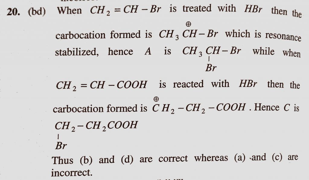 When CH2 = CH – Br is reacted with HBr then the product formed is A and when CH2 = CH – COOH is treated with HBr then the product formed is C. Hence here When CH2 = CH - Br is reacted with HBr then the product formed is A and when CH2 = CH - COOH is treated with HBr then the product formed is C. Hence here December 16, 2020 Category: Uncategorised (JEE Advanced Physics by BM Sharma + GMP Solutions) , Facebook Messenger WhatsApp Share this:TwitterFacebook Related