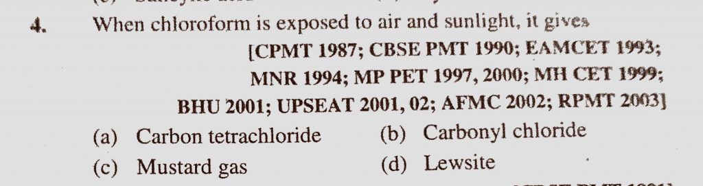 When chloroform is exposed to air and sunlight, it gives (a) Carbon tetrachloride (b) Carbonyl chloride (c) Mustard gas (d) Lewsite it gives (a) Carbon tetrachloride (b) Carbonyl chloride (c) Mustard gas (d) Lewsite When chloroform is exposed to air and sunlight December 17, 2020 Category: Uncategorised (JEE Advanced Physics by BM Sharma + GMP Solutions) , Facebook Messenger WhatsApp Share this:TwitterFacebook Related