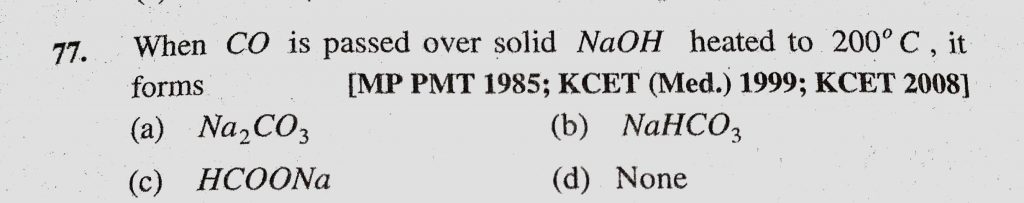 When CO is passed over solid NaOH heated to 200 C, it forms (a) Na2CO3 (b) NaHCO3 (c) HCOONa (d) None it forms (a) Na2CO3 (b) NaHCO3 (c) HCOONa (d) None When CO is passed over solid NaOH heated to 200 C November 13, 2020 Category: Uncategorised (JEE Advanced Physics by BM Sharma + GMP Solutions) , Facebook Messenger WhatsApp Share this:TwitterFacebook Related