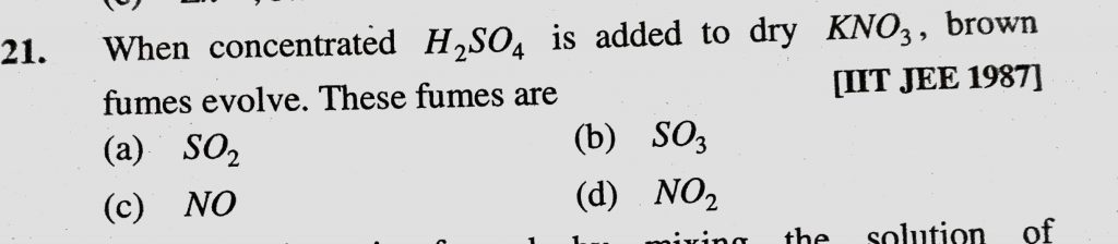 When concentrated H2SO4 is added to dry KNO3, brown fumes evolve. These fumes are brown fumes evolve. These fumes are When concentrated H2SO4 is added to dry KNO3 December 7, 2020 Category: Uncategorised (JEE Advanced Physics by BM Sharma + GMP Solutions) , Facebook Messenger WhatsApp Share this:TwitterFacebook Related