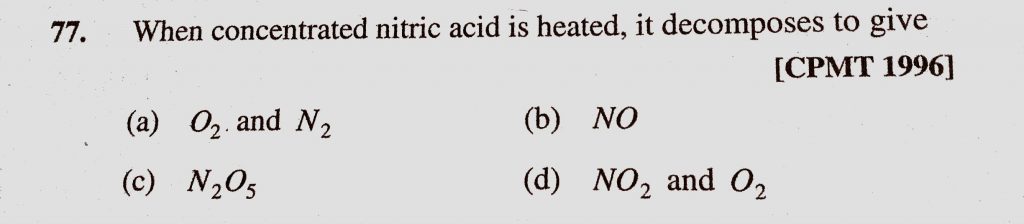 When concentrated nitric acid is heated, it decomposes to give (a) O2 and N2 (b) NO (c) N2O5 (d) NO2 and O2 it decomposes to give (a) O2 and N2 (b) NO (c) N2O5 (d) NO2 and O2 When concentrated nitric acid is heated November 18, 2020 Category: Uncategorised (JEE Advanced Physics by BM Sharma + GMP Solutions) , Facebook Messenger WhatsApp Share this:TwitterFacebook Related