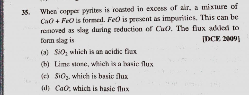When copper pyrites is roasted in excess of air, a mixture of CuO + FeO is formed. FeO is present as impurities. This can be removed as slag during reduction of CuO. The flux added to a mixture of CuO + FeO is formed. FeO is present as impurities. This can be removed as slag during reduction of CuO. The flux added to When copper pyrites is roasted in excess of air November 12, 2020 Category: Uncategorised (JEE Advanced Physics by BM Sharma + GMP Solutions) , Facebook Messenger WhatsApp Share this:TwitterFacebook Related