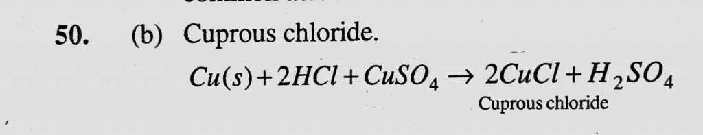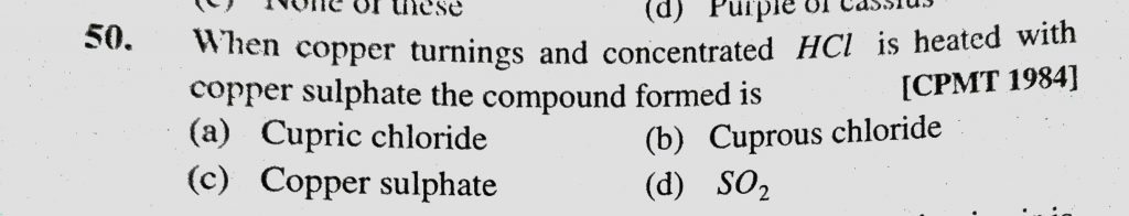 When copper turnings and concentrated HCl is heated with copper sulphate the compound formed is (a) Cupric chloride (b) Cuprous chloride When copper turnings and concentrated HCl is heated with copper sulphate the compound formed is (a) Cupric chloride (b) Cuprous chloride December 1, 2020 Category: Uncategorised (JEE Advanced Physics by BM Sharma + GMP Solutions) , Facebook Messenger WhatsApp Share this:TwitterFacebook Related