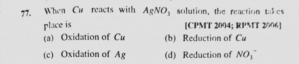 When Cu reacts with AgNO3 solution, the reaction takes place is (a) Oxidation of Cu (b) Reduction of Cu (c) Oxidation of Ag the reaction takes place is (a) Oxidation of Cu (b) Reduction of Cu (c) Oxidation of Ag When Cu reacts with AgNO3 solution December 1, 2020 Category: Uncategorised (JEE Advanced Physics by BM Sharma + GMP Solutions) , Facebook Messenger WhatsApp Share this:TwitterFacebook Related
