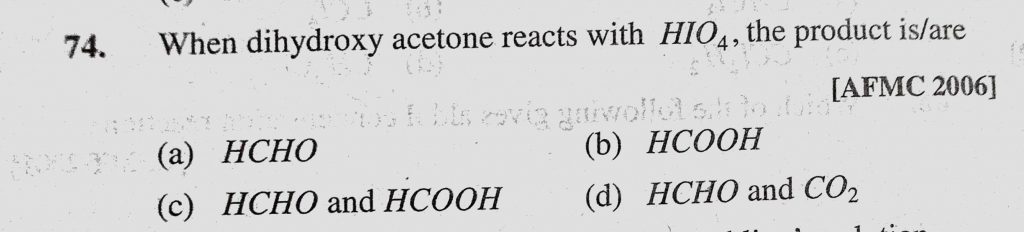 When dihydroxy acetone reacts with HIO4, the product is / are (a) HCHO (b) HCOOH (c) HCHO and HCOOH (d) HCHO and CO2 the product is / are (a) HCHO (b) HCOOH (c) HCHO and HCOOH (d) HCHO and CO2 When dihydroxy acetone reacts with HIO4 February 12, 2021 Category: Uncategorised (JEE Advanced Physics by BM Sharma + GMP Solutions) , Facebook Messenger WhatsApp Share this:TwitterFacebook Related