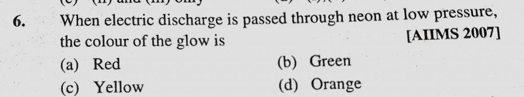 When electric discharge is passed through neon at low pressure, the colour of the glow is (a) Red (b) Green (c) Yellow (d) Orange the colour of the glow is (a) Red (b) Green (c) Yellow (d) Orange When electric discharge is passed through neon at low pressure November 25, 2020 Category: Uncategorised (JEE Advanced Physics by BM Sharma + GMP Solutions) , Facebook Messenger WhatsApp Share this:TwitterFacebook Related
