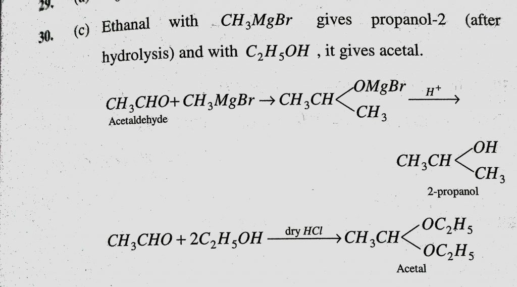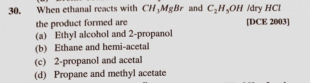 When ethanal reacts with CH3MgBr and C2H5OH / dry HCl the product formed are (a) Ethyl alcohol and 2-propanol (b) Ethane and hemi-acetal (c) 2-propanol and acetal When ethanal reacts with CH3MgBr and C2H5OH / dry HCl the product formed are (a) Ethyl alcohol and 2-propanol (b) Ethane and hemi-acetal (c) 2-propanol and acetal February 10, 2021 Category: Uncategorised (JEE Advanced Physics by BM Sharma + GMP Solutions) , Facebook Messenger WhatsApp Share this:TwitterFacebook Related
