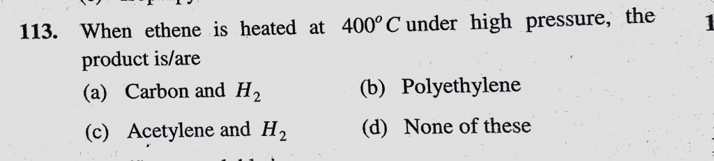 When ethene is heated at 400 C under high pressure, the product is/are (a) Carbon and H2 (b) Polyethylene (c) Acetylene and H2 (d) None of these the product is/are (a) Carbon and H2 (b) Polyethylene (c) Acetylene and H2 (d) None of these When ethene is heated at 400 C under high pressure December 14, 2020 Category: Uncategorised (JEE Advanced Physics by BM Sharma + GMP Solutions) , Facebook Messenger WhatsApp Share this:TwitterFacebook Related