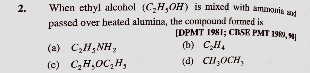 When ethyl alcohol (C2H5OH) is mixed with ammonia and passed over heated alumina, the compound formed is (a) C2H5NH2 (b) C2H4 (c) C2H5OC2H5 (d) CH3OCH3 the compound formed is (a) C2H5NH2 (b) C2H4 (c) C2H5OC2H5 (d) CH3OCH3 When ethyl alcohol (C2H5OH) is mixed with ammonia and passed over heated alumina February 10, 2021 Category: Uncategorised (JEE Advanced Physics by BM Sharma + GMP Solutions) , Facebook Messenger WhatsApp Share this:TwitterFacebook Related