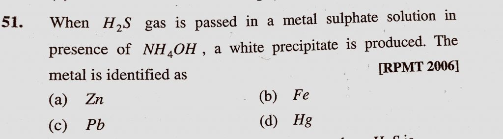 When H2S gas is passed in a metal sulphate solution in presence of NH4OH, a white precipitate is produced. The metal is identified as a white precipitate is produced. The metal is identified as When H2S gas is passed in a metal sulphate solution in presence of NH4OH December 7, 2020 Category: Uncategorised (JEE Advanced Physics by BM Sharma + GMP Solutions) , Facebook Messenger WhatsApp Share this:TwitterFacebook Related