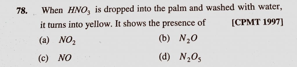 When HNO3 is dropped into the palm and washed with water, it turns into yellow. It shows the presence of (a) NO2 (b) N2O (c) NO (d) N2O5 it turns into yellow. It shows the presence of (a) NO2 (b) N2O (c) NO (d) N2O5 When HNO3 is dropped into the palm and washed with water November 18, 2020 Category: Uncategorised (JEE Advanced Physics by BM Sharma + GMP Solutions) , Facebook Messenger WhatsApp Share this:TwitterFacebook Related