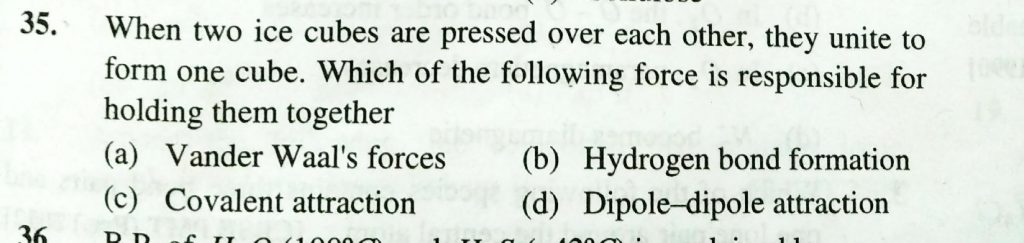 When ice cubes are passed over each other , they unite to form one cube . Which of the following force is responsible for holding them together they unite to form one cube . Which of the following force is responsible for holding them together When ice cubes are passed over each other December 9, 2020 Category: Uncategorised (JEE Advanced Physics by BM Sharma + GMP Solutions) , Facebook Messenger WhatsApp Share this:TwitterFacebook Related