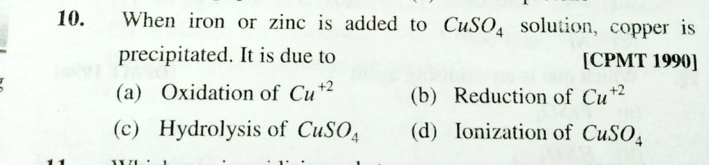 When iron or zinc is adeed to CuSO4 solution , copper is precipitated . It is due to copper is precipitated . It is due to When iron or zinc is adeed to CuSO4 solution November 23, 2020 Category: Uncategorised (JEE Advanced Physics by BM Sharma + GMP Solutions) , Facebook Messenger WhatsApp Share this:TwitterFacebook Related