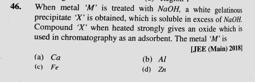 When metal ‘M’ is treated with NaOH, a white gelatinous precipitate ‘X’ is obtained, which is soluble in excess of NaOH. Compound ‘X’ when heated strongly gives an oxide which a white gelatinous precipitate 'X' is obtained When metal 'M' is treated with NaOH which is soluble in excess of NaOH. Compound 'X' when heated strongly gives an oxide which December 8, 2020 Category: Uncategorised (JEE Advanced Physics by BM Sharma + GMP Solutions) , Facebook Messenger WhatsApp Share this:TwitterFacebook Related
