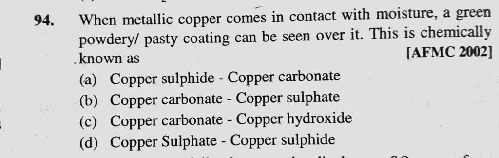 When metallic copper comes in contact with moisture, a green powdery/ pasty coating can be seen over it. This is chemically known as (a) Copper sulphide – Copper carbonate a green powdery/ pasty coating can be seen over it. This is chemically known as (a) Copper sulphide - Copper carbonate When metallic copper comes in contact with moisture December 1, 2020 Category: Uncategorised (JEE Advanced Physics by BM Sharma + GMP Solutions) , Facebook Messenger WhatsApp Share this:TwitterFacebook Related