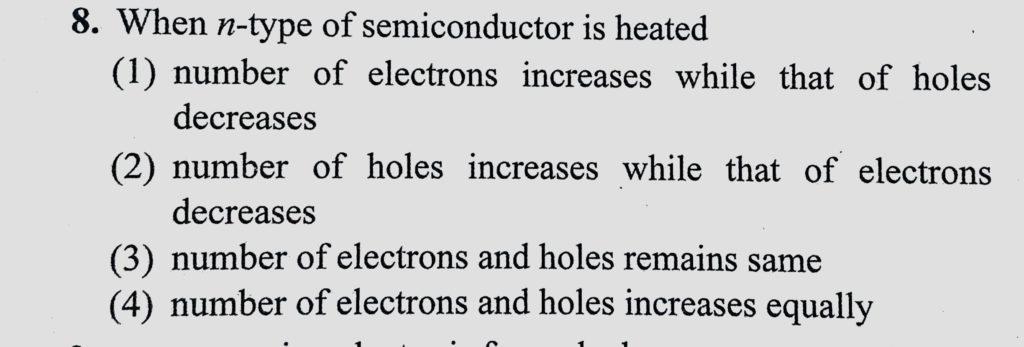 When n-type of semiconductor is heated (1) number of electrons increases while that of holes decreases (2) number of holes increases while that of electrons decreases When n-type of semiconductor is heated (1) number of electrons increases while that of holes decreases (2) number of holes increases while that of electrons decreases October 21, 2020 Category: Uncategorised (JEE Advanced Physics by BM Sharma + GMP Solutions) , Facebook Messenger WhatsApp Share this:TwitterFacebook Related