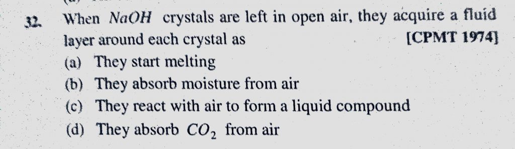 When NaOH crystals are left in open air, they acquire a fluid layer around each crystal as (a) They start melting (b) They absorb moisture from air they acquire a fluid layer around each crystal as (a) They start melting (b) They absorb moisture from air When NaOH crystals are left in open air November 13, 2020 Category: Uncategorised (JEE Advanced Physics by BM Sharma + GMP Solutions) , Facebook Messenger WhatsApp Share this:TwitterFacebook Related