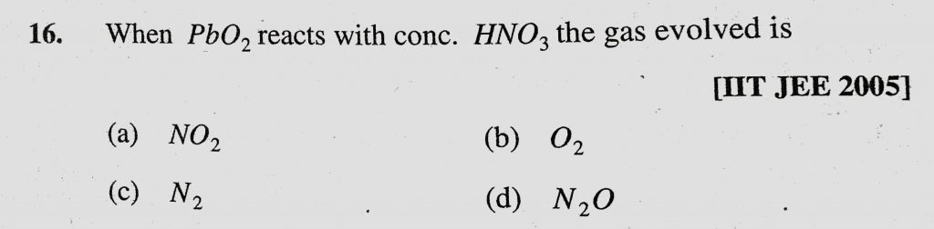 When PbO2 reacts with conc. HNO3 the gas evolved is (a) NO2 (b) O2 (c) N2 (d) N2O When PbO2 reacts with conc. HNO3 the gas evolved is (a) NO2 (b) O2 (c) N2 (d) N2O November 28, 2020 Category: Uncategorised (JEE Advanced Physics by BM Sharma + GMP Solutions) , Facebook Messenger WhatsApp Share this:TwitterFacebook Related
