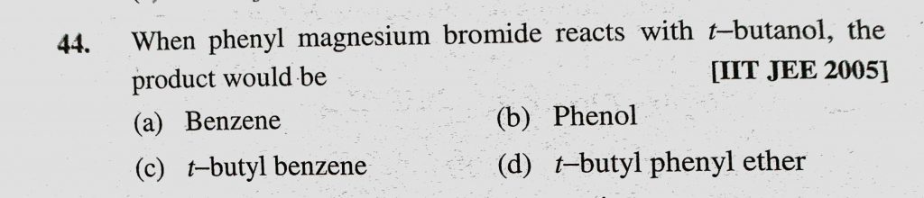 When phenyl magnesium bromide reacts with t-butanol, the product would be (a) Benzene (b) Phenol (c) t-butyl benzene (d) t-butyl phenyl ether the product would be (a) Benzene (b) Phenol (c) t-butyl benzene (d) t-butyl phenyl ether When phenyl magnesium bromide reacts with t-butanol February 9, 2021 Category: Uncategorised (JEE Advanced Physics by BM Sharma + GMP Solutions) , Facebook Messenger WhatsApp Share this:TwitterFacebook Related