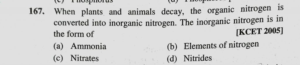 When plants and animals decay, the organic nitrogen is converted into inorganic nitrogen. The inorganic nitrogen is in the form of (a) Ammonia (b) Elements of nitrogen the organic nitrogen is converted into inorganic nitrogen. The inorganic nitrogen is in the form of (a) Ammonia (b) Elements of nitrogen When plants and animals decay November 23, 2020 Category: Uncategorised (JEE Advanced Physics by BM Sharma + GMP Solutions) , Facebook Messenger WhatsApp Share this:TwitterFacebook Related